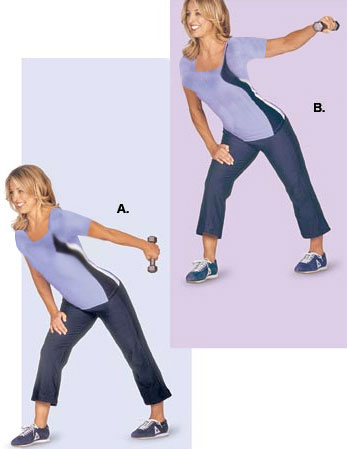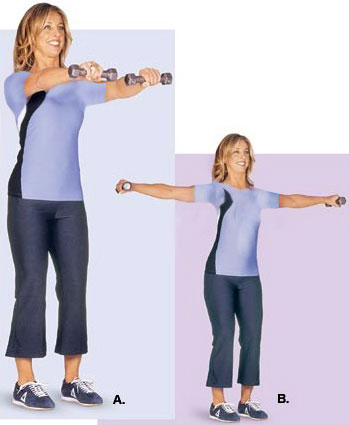 - بایستید و پاهایتان را به اندازه عرض شانه باز کنید. در هر کدام از دستهایتان یک دمبل 3 الی 5 پوندی(معادل 1.5 الی 2.5 کیلوگرم) قرار دهید، دستهایتان را به سمت پهلوها باز کنید. بازوهایتان را به سمت جلو بکشید.