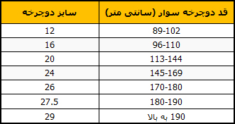 2- سایز دوچرخه : حتما برای همه شمایی که قصد خرید دوچرخه و داشتید و دارید سوال پیش اومده که چه سایز دوچرخه ای برای قد شما مناسب است ؟ برای رسیدن به جواب سوالتون به جدول زیر مراجعه کنید