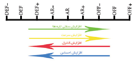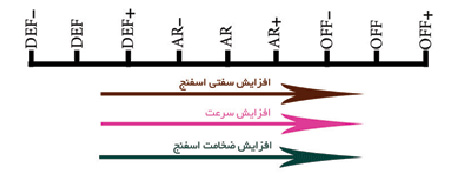 گروه(OFF+……….DEF-) : همانند بخش چوب راکت، این قسمت نشان دهنده سرعت رویه راکت می باشد و هر چه ازDEFensive به سمت OFFensive حرکت کنیم سرعت رویه بیشتر می شود و این مسئله از عواملی مانند نوع ،سفتی ،ضخامت اسفنج و نیز نوع و تکنولوژی لاستیک سرچشمه می گیرد.شکل زیر نشان دهنده این موضوع می باشد.