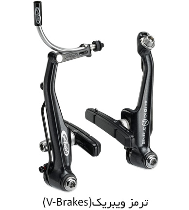 ترمز v-brake : یکی از محبوب ترین ترمزهای cantilever می باشد که از دو اهرم جداگانه تشکیل شده که روی هر اهرم قسمت خاصی برای اتصال پدهای ترمز در نظر گرفته شده است.