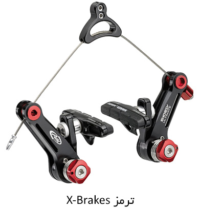 ترمز x-brake : تا حدودی شبیه به ترمزهای v-brake هستند که دارای کابلی است که دو محور ترمز را به صورت متقاطع ( مانند حرف X ) به یکدیگر متصل می کند.