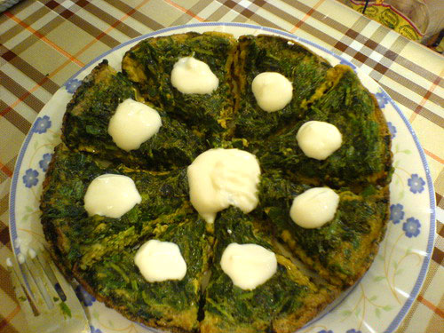 مقداری روغن (حدود 1 قاشق) را در ماهیتابه می ریزیم تا داغ شود. تره فرنگی ها را خرد كرده در روغن كمی حرارت می دهیم. سپس اسفناج خرد كرده را به آن می افزائیم تا اینكه كمی نرم شود. (روی حرارات متوسط 3 دقیقه بماند.) تخم مرغ ها را هم زده، اسفناج، تره فرنگی، پیازچه و تمام سبزیجات را به آن می افزائیم. سپس نمك، فلفل، گردوی خرد شده را اضافه می كنیم. مواد را در ماهیتابه ی دارای روغن داغ (روغن حدود 3 قاشق غذاخوری) ریخته، در ظرف را گذاشته و روی حرارت ملایم می گذاریم تا بپزد. بعد آن را پشت و رو كرده، زیر گریل داخل فر گذاشته تا طلایی شود. (با آن روش از روغن كمتری استفاده می شود)
