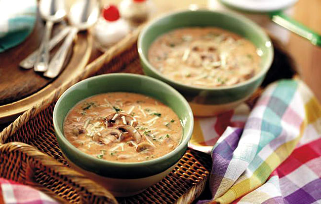 در یک ماهیتابه تفلون کره را آب کرده، قارچ و تره فرنگی را در آن سرخ کنید تا کاملا ترد شوند. آرد، نمک، فلفل، آب مرغ را به آن اضافه کرده و هم بزنید تا زمانیکه به جوش بیاید. حرارت را کم کرده و به مدت 20 دقیقه دیگر آن را بپزید. آن را از روی شعله برداشته کنار بگذارید تا سرد شود. پس از سرد شدن آن را درون مخلوط کن بریزید تا تبدیل به پوره شود. سپس آن را دوباره به داخل ماهیتابه بر گردانید. باقیمانده آب مرغ و خامه را به آن افزوده و چند دقیقه دیگر بپزید.