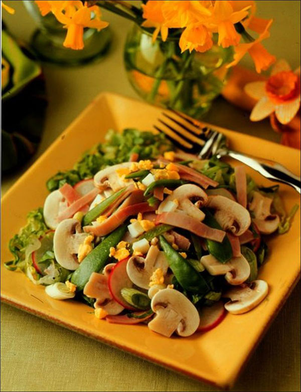 ابتدا قارچ و پيازچه را خرد كرده و با ذرت، نخودفرنگي و جعفري مخلوط ميكنيم. سپس به آن كمي روغن زيتون، نمك و فلفل اضافه و با گوجهفرنگي، خيار و ساقه كرفس تزئين ميكنيم.