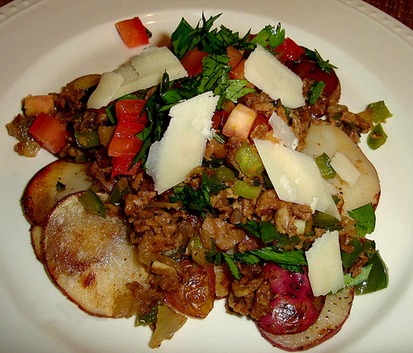 4- آبغوره یا سرکه را اضافه میکنیم و حرارت میدهیم تا هنگامی که بیشتر مایع تبخیر شود، اجازه میدهیم مواد بپزند. عصاره مرغ طبیعی یا قرص آنرا در آب داغ حل کرده، نمک، فلفل سیاه، پودر چیلی و پاپریکا را میافزاییم؛ آنها را بجوش میآوریم. شعله را کم میکنیم تا مواد در همان حال بجوشند. تا وقتی که مایع غلیظ شده و مقدار آن به نصف کاهش یابد، به پخت مواد ادامه میدهیم. جعفری را مخلوط میکنیم. غذا را داغ سرو میکنیم و اگر میخواهیم روی آن یک تخممرغ نیمرو شده قرار میدهیم.