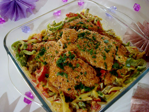 اول پیاز را با روغن تفت میدهیم کمی که تفت خورد سینه مرغ را می ریزیم و با حرارت زیاد چند دقیقه تفتش میدهیم تا مرغ کاملا بپزد بعد قارچ هم اضافه میکنیم و تفت میدیم تا آب قارچ کشیده شود (اگه خیلی تفت دهیم سینه مرغ سفت میشود) بعد از ماهی تابه خارج میکنیم و در همان چربی کم اول کدو بعدفلفل دلمه و بعد هویج را تفت میدهیم (هر کدوم ۵ دقیقه تا تقریبا نرم شود) بعد سینه مرغ تفت خورده را هم میریزیم نمک و ادویه و کمی فلفل هم میریزم و شعله رو خاموش میکنیم. (سبزیجات این غذا نباید له شوند) (این غذا رو با کمی کچاب می شود خورد ـ اگر ماهی تابه نچسب باشد بهتر است)