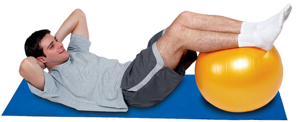 روی کمر دراز بکشید زانوها را خم کنید و کف پاها را به صورت صاف روی زمین قرار دهید. توپ را نزدیک زانو روی ران و دستها را بالای توپ بگذارید. شانه ها را به سمت بالاحرکت داده و توپ را همزمان به بالای زانو هدایت دهید. کمی مکث کنید و به حالت اول بازگردید.