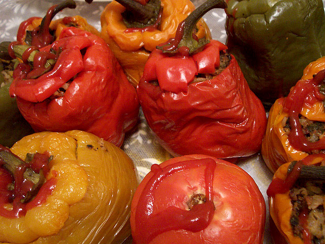 برنج را به مدت یک ساعت بپزید. گوشت، برنج، تخم مرغ و ادویه جات را در یک کاسه بزرگ با هم مخلوط کنید. مخلوط را به شکل 6 عدد توپ درآورید و سپس آنها را در یک قابلمه سرخ کنید. هسته فلفل ها را درآورده، آنها را به دو نیم کنید و در یک کاسه بزرگ قرار دهید. گوشت ها را داخل فلفل سبز ها قرار دهید. سس گوجه فرنگی را روی آنها بریزید. به مدت 30 دقیقه آنها را درون مایکروویو بپزید. گوشت ها را نصف کرده و روی آن سس گوجه فرنگی ریخته و سرو کنید.