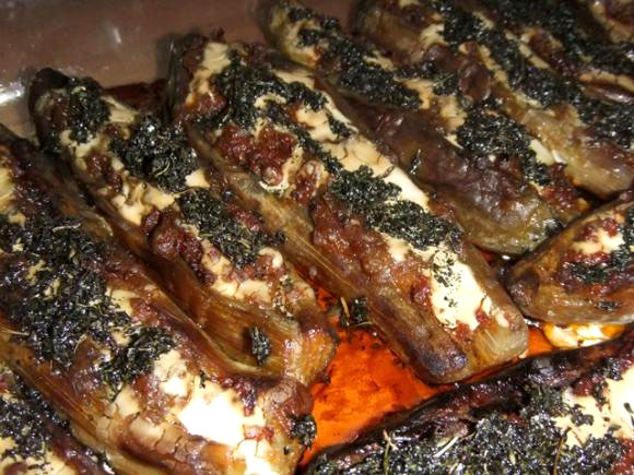 درجه فر را روی ۴۵۰ درجه فارنهایت تنظیم کنید. بادمجان ها را از طول نصف کرده و از سمت داخل وسط بادمجان ها را ببرید، به طوری که پوست آن بریده شود. درون یک فویل را با روغن آغشته کنید و بادمجان ها را از سمتی که بریده اید درون فویل بچینید و ۲۰ دقیقه بگذارید تا بادمجان نرم شود و پوست روی آن چروک شود. سپس آنها را از فر درآورده و در یک صافی بگذارید. ۱۰ دقیقه کنار بگذارید تا سرد شود و سپس آنها را خرد کنید. فر را تا ۳۵۰ درجه فارنهایت کم کنید. هنگامی که بادمجان ها در فر در حال پخته شدن است، یک قاشق چایخوری روغن را روی حرارت ملایم بگذارید. فلفل و پیاز را داخل آن ریخته و ۱۰ ـ ۵ دقیقه سرخ کنید تا نرم و پیازها طلایی شود. کمی نمک بزنید. سپس سیر و بادمجان را داخل آن بریزید و یک دقیقه دیگر هم تفت دهید. از روی شعله بردارید و ادویه آن را تنظیم کنید. ظرف فر را به روغن آغشته کنید و در فر بگذارید در این هنگام از یک کاسه دیگر تخم مرغ ها را بشکنید و جعفری، نمک و دارچین (ادویه) را درون آن ریخته و به هم بزنید. سپس بادمجان را داخل تخم مرغ ریخته و خوب مخلوط کنید. ظرف را از فر بیرون بیاورید و مخلوط تخم مرغ را درون آن بریزید. باید ۴۰ ـ ۳۵ دقیقه برای پخت آن منتظر بمانید تا روی آن طلایی شود. سپس از فر بیرون بیاورید. ۱۰ دقیقه صبر کنید تا سرد شود و به طور دلخواه آن را برش دهید و سرو کنید.