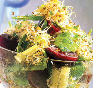 تمامی مواد فوق را با هم مخلوط می کنیم، در ظرف مناسبی یک تا دو برگ بزرگ کلم را در ته ظرف قرار می دهیم و مواد را داخل آنها می ریزیم و دور تا دور آن را با جوانه گندم پر می کنیم، هنگام سرو مخلوطی از نمک و فلفل و سرکه و روغن زیتون را روی سالاد میریزیم در صورت تمایل می توانید به جای روغن زیتون از روغن های دیگر مخصوص سالاد هم استفاده کنید و در صورت نداشتن رژیم خاص غذایی می توانید از انواع سس سالاد نیز استفاده کنید.