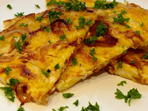 در ماهی تابه نچسب مقداری روغن بریزید و بعد از ۲ تا ۳ دقیقه پیاز و قارچ را به مواد اضافه کنید، سپس سبزیجات و گوجه فرنگی خرد شده را به مواد اضافه کنید و در صورت نیاز مقدری روغن اضافه کنید. وقتی گوجه فرنگی ها کاملا نرم شد اسفناج را به مواد اضافه کنید تا زمانی اسفناج ها پخته شوند. مواد را در ماهی تابه به صورت یکسان پخش کنید و در آخر سفیده تخم مرغ را با فلفل سیاه مخلوط کنید و به صورت یکسان در ماهی تابه و روی سبزیجات بریزید تا زمانی که سفیده کاملا سفت شود.