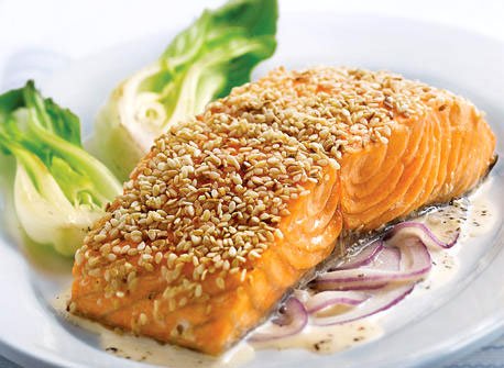 4- سالمون‌ها را در ظرف مناسب کشیده و باقی سس را به همراه کنجد بو داده روی آن ریخته و سرو می‌کنیم.