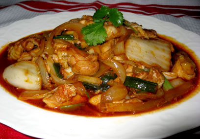 گوشت مرغ را که ترجیحاً از سینه انتخاب کرده‌اید، به صورت مکعبی خرد کرده و با روغن و سیر مقداری سرخ کنید تا گوشت نرم شود. سپس فلفل خردشده و آناناس را داخل گوشت بریزید. در ظرف را گذاشته و اجازه دهید تا مواد گوشت و فلفل نرم و پخته شوند و طعم آنها به خورد یکدیگر برود. حالا پیازچه را داخل مواد ریخته و آرد ذرت و سس سویا را با هم مخلوط کنید. به دلیل داشتن سویا سس این غذا نیاز به نمک کمتری دارد. پس حتماً نمک غذا را بعد از ریختن سویا سس اندازه کنید و زنجبیل و فلفل را بیفزایید. حالا همه مواد را با هم خوب مخلوط کنید و روی شعله ملایم قرار دهید تا آماده شود. خوراک مرغ چینی با نان سرو می‌شود.