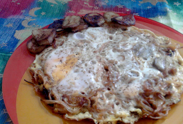 بادنجانها رو با پوست حلقه کرده و در آب نمک بذارین تا کمتر روغن ببره . بعد بشورین و خشک کنین و سرخ کنین. بعد کف تابه رو چرب کرده و لابلا با پباز داغ داخل ظرف بریزین و بذارین حدود ده دقیقه بپزه.  بعد تخم مرغ ها رو زده و با شیر و آرد و نمک و ادویه و فلفل مخلوط کنین و روی بادنجانها بریزین و بذارین روی حرارت تا خودش رو بگیره  و بعد تا هنوز داغه سرو کنین.