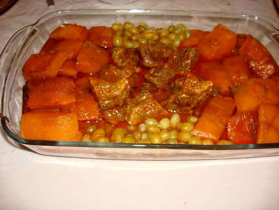 ابتدا کدو را شسته و پس از پوست کندن، به صورت هلال‌های کوچک خرد کنید. سپس یک عدد از پیازها را ریز کرده و در تابه‌ای حاوی روغن سرخ کنید تا کمی طلایی‌رنگ شود. حالا کدوی خرد شده را به پیاز داغ اضافه کنید و همراه با آن تفت دهید. گوشت را نیز شسته و در سبدی بریزید تا آب اضافی آن خارج شود. پس از آن، پیاز دیگری را نیز به صورت خلالی خرد کنید. سپس داخل قابلمه‌ای مقداری روغن بریزید و روی شعله اجاق‌گاز قرار دهید. حالا پیاز خردشده را در روغن سرخ کنید. در حین سرخ‌شدن پیاز، تکه‌های گوشت را نیز اضافه کرده و به همراه پیاز تفت دهید. حالا برای پختن گوشت، 2 پیمانه آب جوشیده را به مخلوط گوشت و پیاز داغ افزوده و در ظرف را بگذارید تا گوشت روی حرارت کم اجاق‌گاز بپزد.