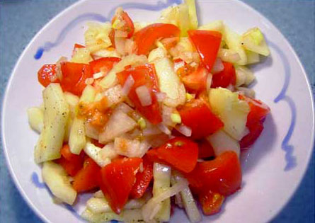 تمام مواد را در یک کاسه با هم مخلوط کنید. به مدت نیم ساعت آن را کنار بگذارید تا مواد آن طعم بگیرد. آن را همراه غذا و یا بدون غذا سرو کنید.