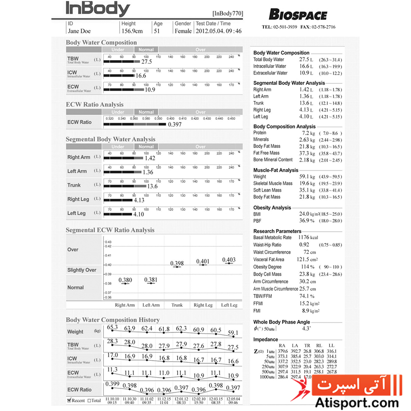 - آنالیز چاقی شامل شاخص توده بدنی (BMI) و درصد چربی کل بدن