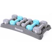 ست دمبل ریباک شامل دو وزنه یک کیلو گرمی ،دو وزنه دو کیلو گرمی و دو وزنه سه کیلوگرمی و با روکش وینلی بوده که می توان انها را در کیس مخصوص این ست قرار داد .این ست برای کسانی که می خواهند عضلات خود را تقویت کرده و شکل دهند، ایده ال می باشد.