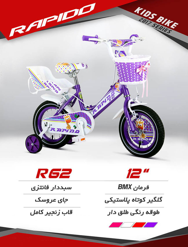 قیمت دوچرخه بچگانه سایز 12 Rapido R62 2017 با مشخصات و 1 سال گارانتی بدنه شرکت مهرآیین وندا در آتی اسپرت - مشاوره تخصصی خرید