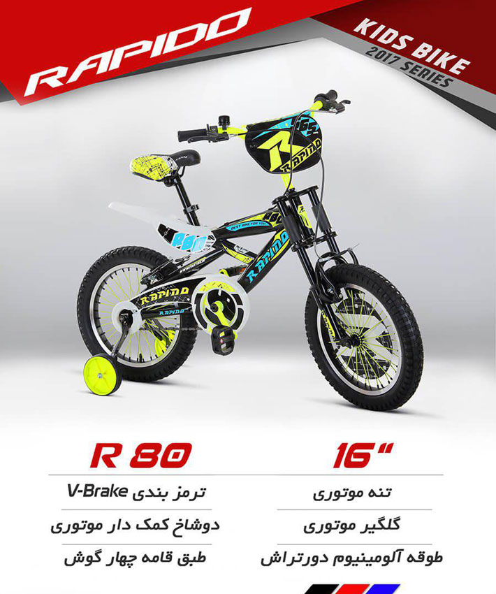 قیمت دوچرخه بچگانه سایز 16 Rapido R80 2017 با مشخصات و 1 سال گارانتی بدنه شرکت مهرآیین وندا در آتی اسپرت - مشاوره تخصصی خرید
