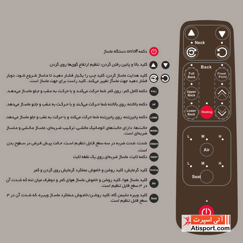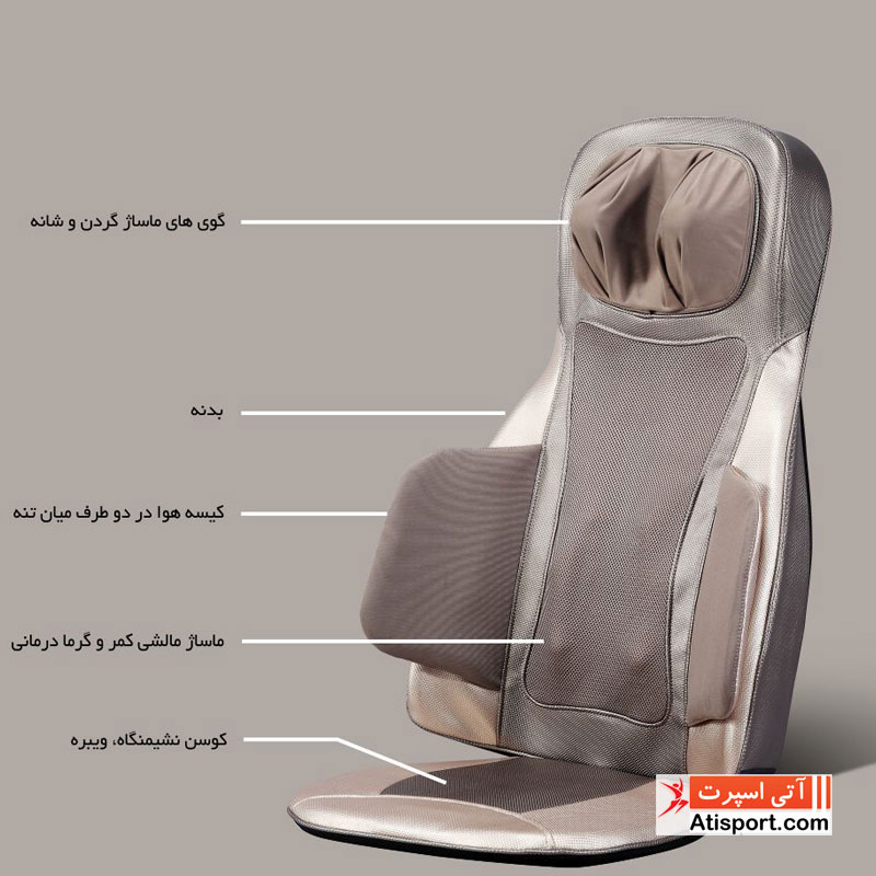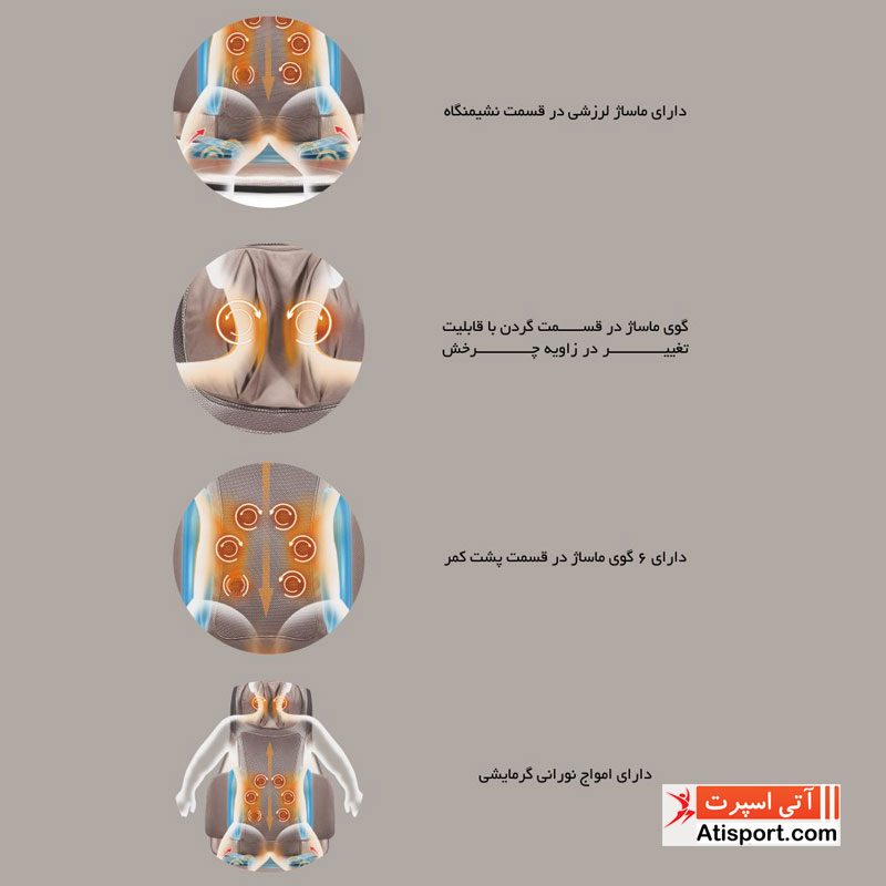 در قسمت گردن گویهای ماساژی قرار دارند که میتوان ارتفاع گویها را روی گردن تغییر داد و بالا و پایین کرد؛ همچنین میتوان جهت چرخش گویها را هم تغییر داد. قسمت پشتی صندلی و گردن مجهز به گرمکن است که به کمک تابش اشعهی مادونقرمز تا دمای 15 درجهی سانتیگراد گرم میشود. در دو طرف پهلو و نشیمنگاه کیسههای هوایی وجود دارند که توسط پمپ دستگاه باد میشوند و با فشار، عضلات این ناحیه را ماساژ میدهند.