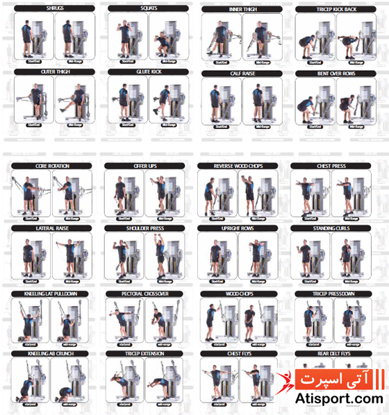 - اسکات، داخل و خارح پا هیپ، پشت بازو خم، کیک بک، ساق ایستاده، پرس سینه، جلو بازو کابل، پشت بازو کابل ایستاده، شکم کرانچ به زانو، لت یا عمود زیربغل، فلای بک، دلتوید از جلو ایستاده، پرس سرشانه کابل، نشر جانب، نشر جلو، لت ایستاده و ...