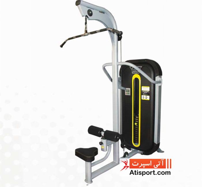 روی دستگاه نشسته.میله را بگیرید و به آرامی پایین بکشید تا بالای سینه مکث کرده و به نقطه شروع باز گردید.