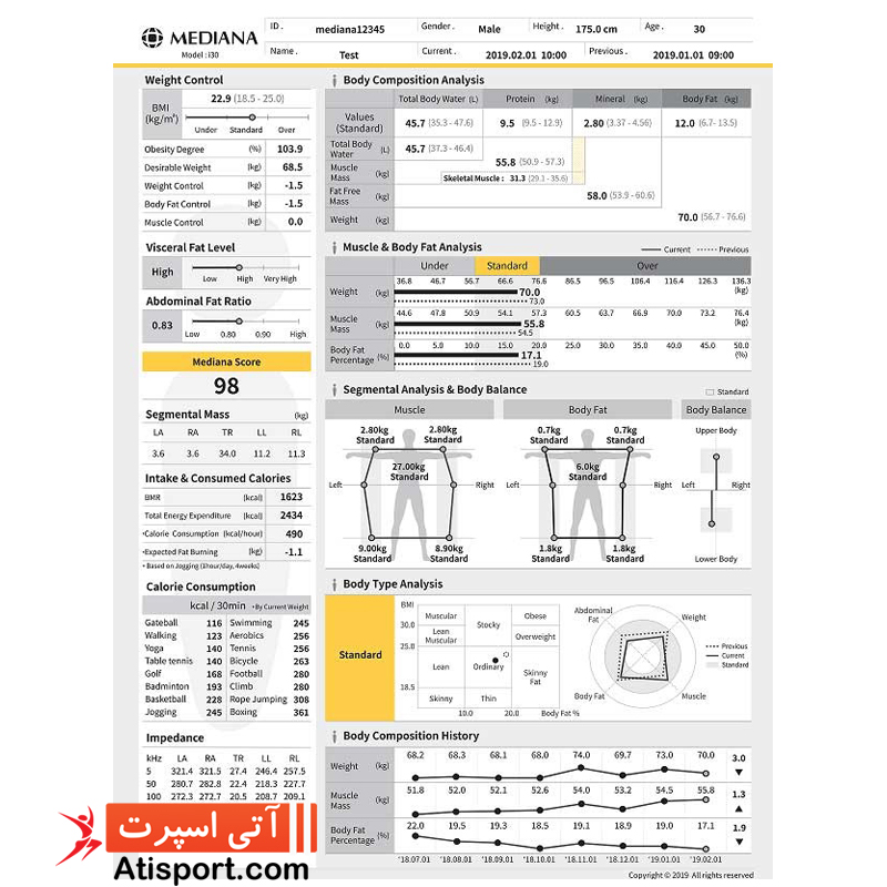 - تجزیه و تحلیل ترکیبات بدن: کل آب بدن، توده عضلانی، توده چربی، توده بدون چربی، پروتئین، مواد معدنی، ماهیچه های اسکلتی، نسبت آب خارج سلولی