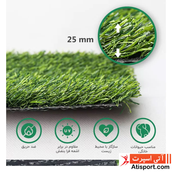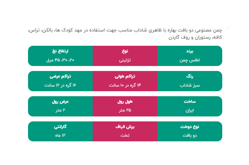 - حداقل ثبت سفارش : 20 متر چمن مصنوعی دو بافت بهاره چیست؟ چمن مصنوعی بهاره دو بافت مناسب جهت مصارف تزئینی و استفاده در مهد کودک ها، رستوران ها، کافه ها و روف گاردن می باشد. همچنین این چمن مصنوعی از لطافت خاصی برخوردار است که مناسب استفاده در محوطه های با تردد بدون کفش که چمن با پوست بدن مستقیم در ارتباط است مناسب می باشد. مزایای چمن مصنوعی دو بافت بهاره مقاومت در برابر شرایط جوی عدم نیاز به نگهداری مکرر چمن مصنوعی دو بافت بهاره 25 میلیمتر |