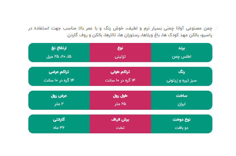 چمن مصنوعی آوانا با ارتفاعهای 15 و 25 میلیمتر و نیز نسخه اقتصادی با ارتفاع 15 میلیمتر، گزینه های متنوعی برای ایجاد فضاهای سبز و زیبا با کیفیت و دوام مناسب هستند. با توجه به نیازها و محیط مورد استفاده، انتخاب ارتفاع مناسب می تواند به ایجاد یک محیط زیبا و دلنشین کمک کند.