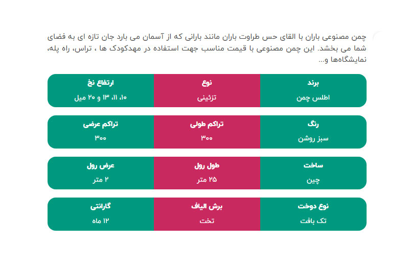 چمن مصنوعی باران با ارتفاع نخ 10، 11 و 13 میل و قیمت ارزان یکی از پر فروش ترین چمن مصنوعی ها می باشد. این چمن مصنوعی از دسته چمن مصنوعی موکتی می باشد. چمن مصنوعی باران را می توان به عنوان کفپوش در بسیاری از محیط ها استفاده کرد. برای اینکه بتوانید انتخاب راحت تری در زمینه خرید چمن مصنوعی موکتی داشته باشید در ادامه موارد کاربرد چمن مصنوعی را شرح خواهیم داد.
