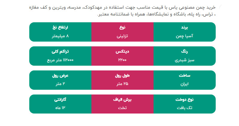 - حداقل ثبت سفارش : 20 متر چمن مصنوعی یاس چیست؟ چمن مصنوعی یاس یک نوع پوشش گیاهی مصنوعی است که به طور طبیعی و زیبا به نظر می رسد و برای فضاهای سبز در محیط های داخلی و خارجی استفاده می شود. این نوع چمن بر خلاف چمن طبیعی، نیاز کمتری به آبیاری و مراقبت دارد و میتواند ظاهری تمیز و خوش نما را برای فضا ها ایجاد کند. چمن مصنوعی یاس 8 میلیمتر در محیط های مسکونی، تجاری و ورزشی بسیار مورد استفاده قرار میگیرد. اگر به دنبال ارزان ترین و شاداب ترین محصول چمن مصنوعی کشور هستید ما به شما چمن مصنوعی یاس را پیشنهاد می دهیم. چمن مصنوعی یاس که الیاف آن ساخت شرکت تیولون هلند است. این محصول از نظر ساختار و قیمت بی نظیر بوده و تنها محصولی که شباهت به این محصول دارد چمن مصنوعی فیروزه می باشد. یکی از ویژگی هایی که این دو محصول را از هم متمایز می کند ارتفاع الیاف آنها است چمن مصنوعی فیروزه دارای الیافی با ارتفاع 11 میلی متر و چمن مصنوعی یاس دارای الیافی با ارتفاع 8 میلی متر می باشد. چمن مصنوعی یاس با توجه به ارتفاع کمتری که نسبت به چمن مصنوعی فیروزه دارد متراکم تر بوده و قابلیت کاربردهای متنوع تری از جمله استفاده در زمین های ورزش گلف را دارد. ویژگی بعدی چمن مصنوعی یاس داشتن لایه زیرین نرم می باشد که امکان استفاده از این محصول در سطوحی که دارای شکستگی مانند پله است را آسان می کند. الیاف این محصول به رنگ سبز روشن و پر انرژی است که برای استفاده در مهد کودک ها، ویترین ها و نمایشگاه ها و موارد تزئینی بسیار مناسب می باشد. ویژگیهای چمن مصنوعی یاس 8 میلیمتر مقاومت در برابر آب و هوا: چمن مصنوعی یاس 8 میلیمتر با داشتن ویژگی های مقاومت در برابر نور خورشید، رطوبت و سایش، به صورت مطلوب در تمام فصول سال به کار می رود. طول عمر بالا: با رعایت دستورالعملهای نصب و نگهداری، چمن مصنوعی یاس 8 میلیمتر می تواند طولانی مدت به شکل خوبی حفظ شود و طول عمر بالایی داشته باشد. مراقبت و نگهداری چمن مصنوعی یاس 8 میلیمتر تمیز کردن با مکنده: برای حذف برگها و ذرات غبار از روی چمن، می توانید از مکنده استفاده کنید. شستشو با آب: برای حذف لکه ها و گرد و غبار، میتوانید چمن مصنوعی را با آب و مایع شستشو شستشو دهید. از استفاده از مواد شیمیایی قوی خودداری کنید. جلوگیری از آسیب: از استفاده از وسایل تیز و سنگین روی چمن مصنوعی یاس 8 میلیمتر خودداری کنید تا دتا آسیبی به سطح آن وارد نشود. تأثیرات محیطی و پایداری