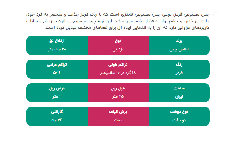 قیمت: چمن مصنوعی قرمز به دلیل رنگ خاص خود، کمی گران تر از چمن مصنوعی سبز است.