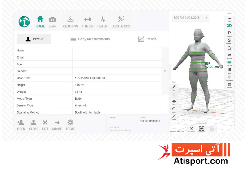 در قسمت Profile اطلاعات کاربر که شامل مشخصات کامل شخص: نام، ایمیل کاربر، سن، جنسیت، زمان اسکن، قد، وزن و تاریخ و زمان دقیق اسکن انجام شده موجود می باشد.