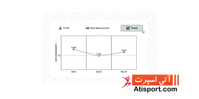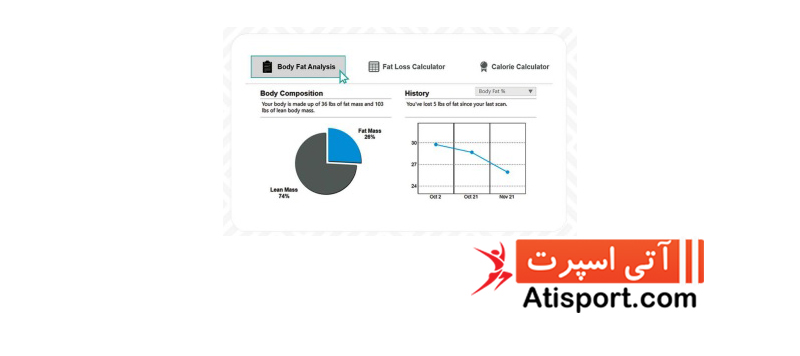 در این بخش درصد چربی به صورت نمودار دایره ای نمایش داده شده و در صورت اسکنهای متفاوت نمودار خطی نیز در کنار آن می باشد که قابلیت مقایسه را به ما می دهد. در قسمت پایین نیز رتبه فرد برای وضعیت بدنی را نمایش می دهد که در چه رده ای قرار دارد. زیر این نمودار نیز وضعیت بدنی فرد در مقایسه با افراد دیگر در جنسیت و محدوده ی سنی یکسان نمایش داده شده است.