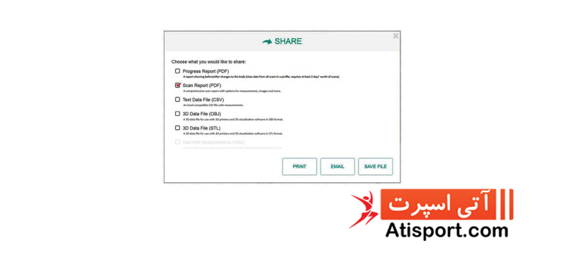 در این بخش می توان گزارشات را به صورت فایلهای PDF و CSV و OBJ و STL به کاربر ارائه کرد. این گزارشات شامل تمامی نمودارها و اندازه های داخل نرم افزار می باشد.