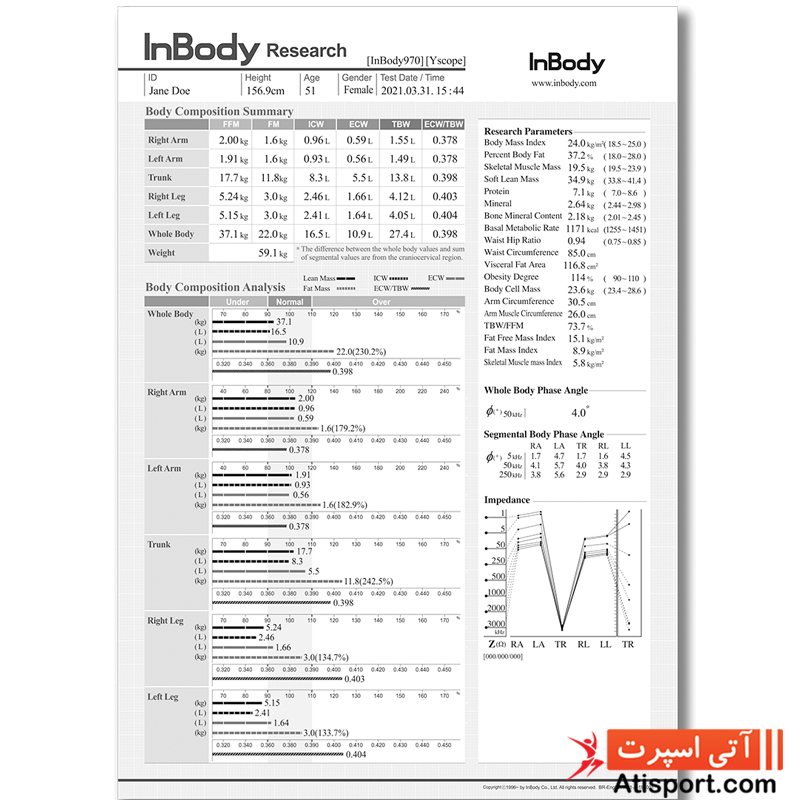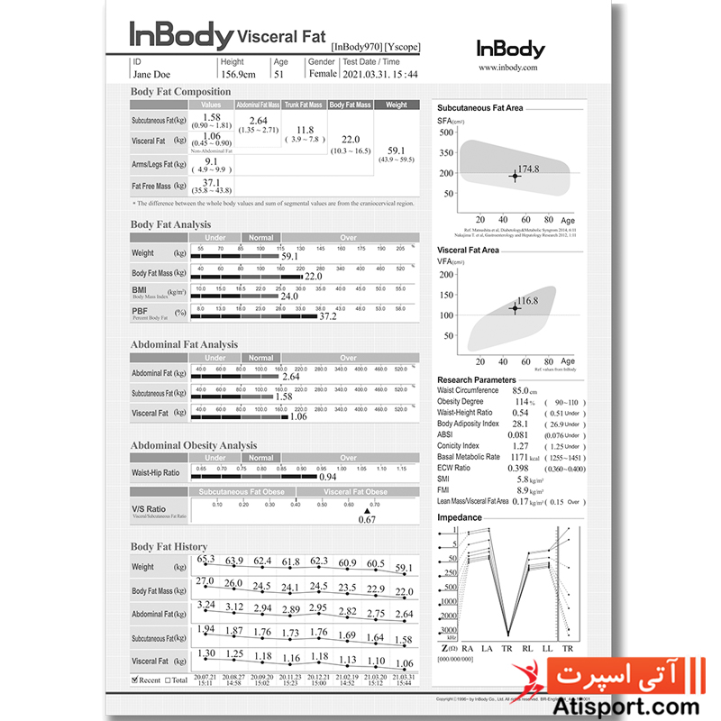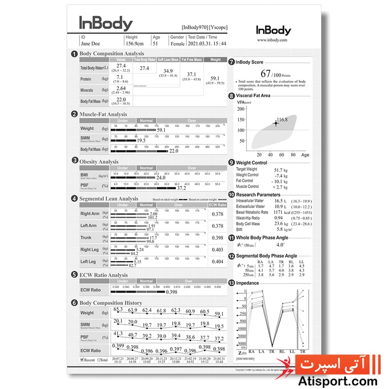 - پارامتـرهاي مختلف تحقیقـاتی شـــامل BMR(انرژي متابولیسـم پـایه)، دور کـمر به دور باسن، درجه چاقی، SMI، چربی احشایی و توده سلولی بدن