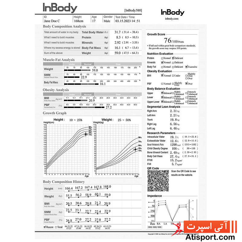 - آنالیز چاقی شامل شاخص توده بدنی (BMI) و درصد چربی کل بدن