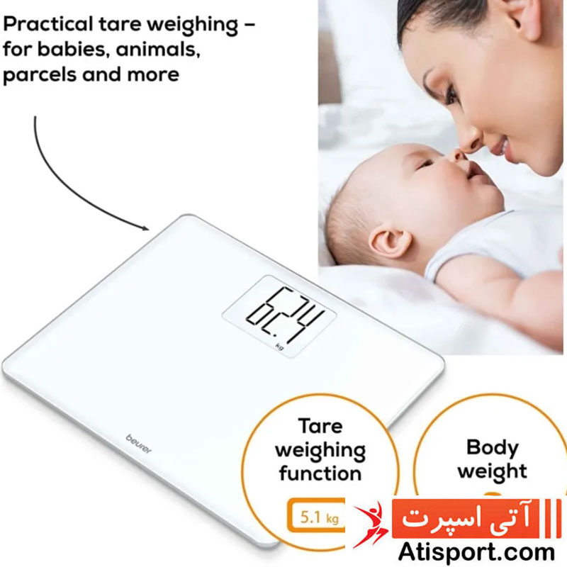 بیورر آلمان از دیرباز متخصص ساخت ترازوهای وزن کشی دقیق و دارای آپشن بوده است.ترازوهای سری GS ساخته شده از شیشه نشکن مقاوم بوده و ترازوی GS340 دارای ابعاد بزرگ و صفحه خوانای عالی میباشد.ویژگی دیگر آن عملکرد تارا میباشد.این عملکرد به این معنی است که میتوانید مثلا کودک یا نوزاد را در آغوش گرفته و به کمک عملکرد تارا فقط وزن او را محاسبه نمایید.همچنین اگر حیوان خانگی یا چمدان دارید نیز میتوانید وزن هر کدام را جداگانه بدست آوردید.