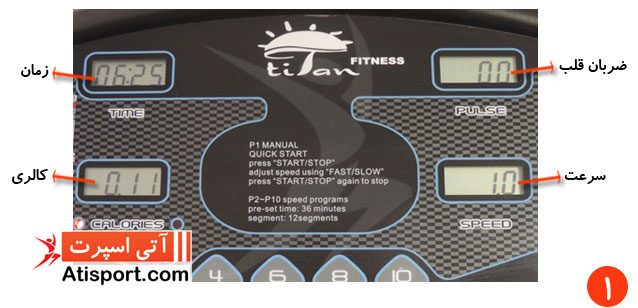 در تصویر شماره 1 شما می توانید نمایشگر تردمیل تایتان فیتنس TF5000 را که نشان دهنده کالری ، زمان ، ضربان قلب و سرعت و دارای 4 برنامه اتوماتیک و یک برنامه دستی می باشد را مشاهده نمایید .