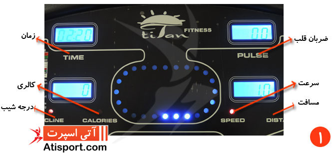 1 - در تصویر شماره 1 شما می توانید نمایشگر مانیتور تردمیل تایتان فیتنس TF6700V را که نشان دهنده کالری، زمان، مسافت، ضربان قلب،درجه شیب، سرعت و همچنین دارا بودن یک برنامه دستی و 9 برنامه اتوماتیک می باشد را مشاهده نمایید .