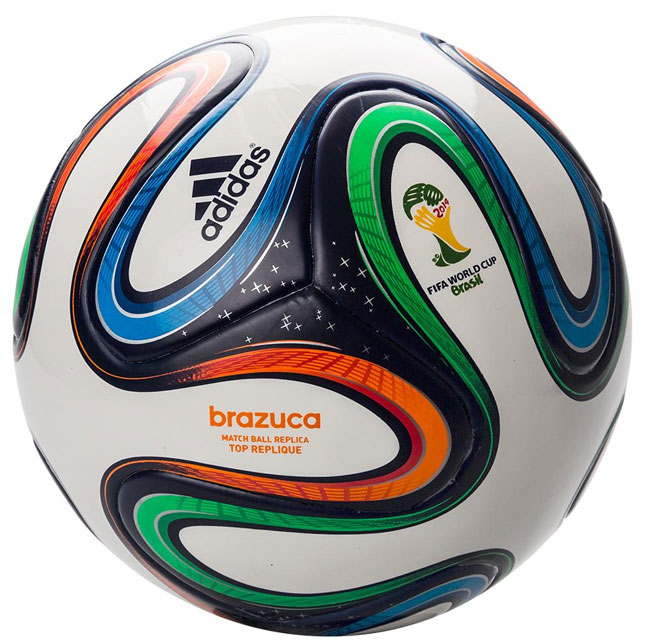 توپ فوتبال جام جهانی 2014 Adidas brazuca : این توپ محصول شرکت آلمانی تولید لوازم ورزشی آدیداس که اسپانسر اصلی توپهای جامهای جهانی می باشد، برازوکا یک اصطلاح برزیلی بوده، به معنای اهل برزیل. در طراحی توپ برازوکا از رگههایی برجسته از رنگهای سبز، آبی و قرمز روی نواری مشکی با پس زمینه سفید توپ استفاده شده است. |
