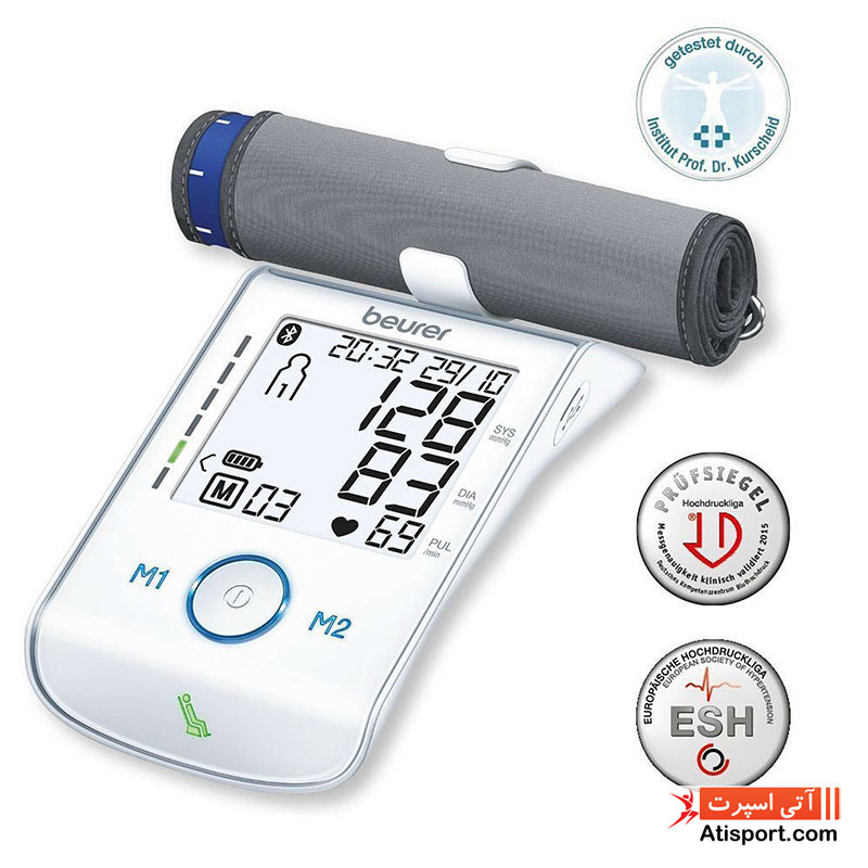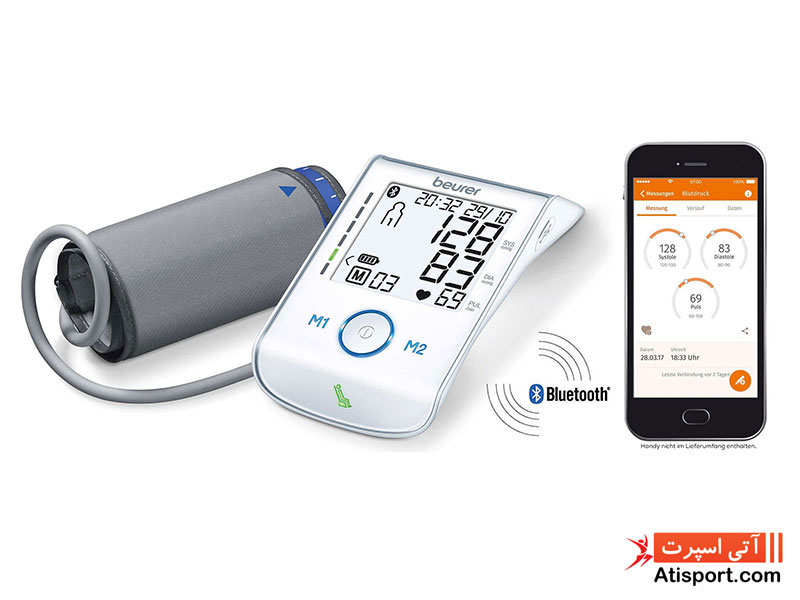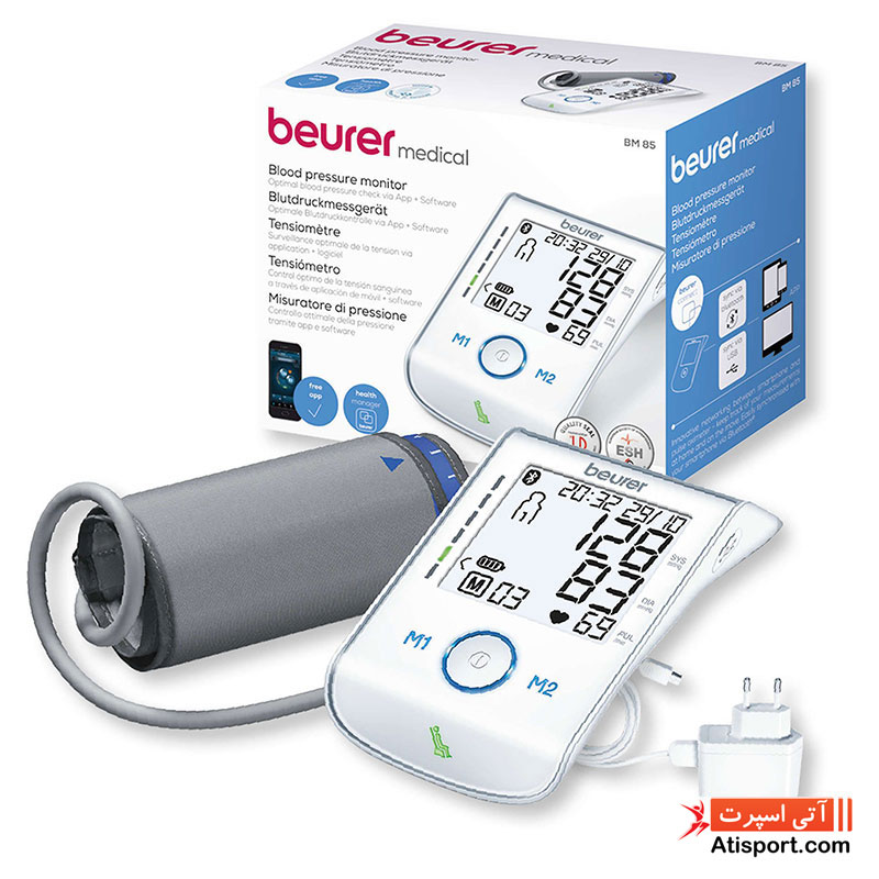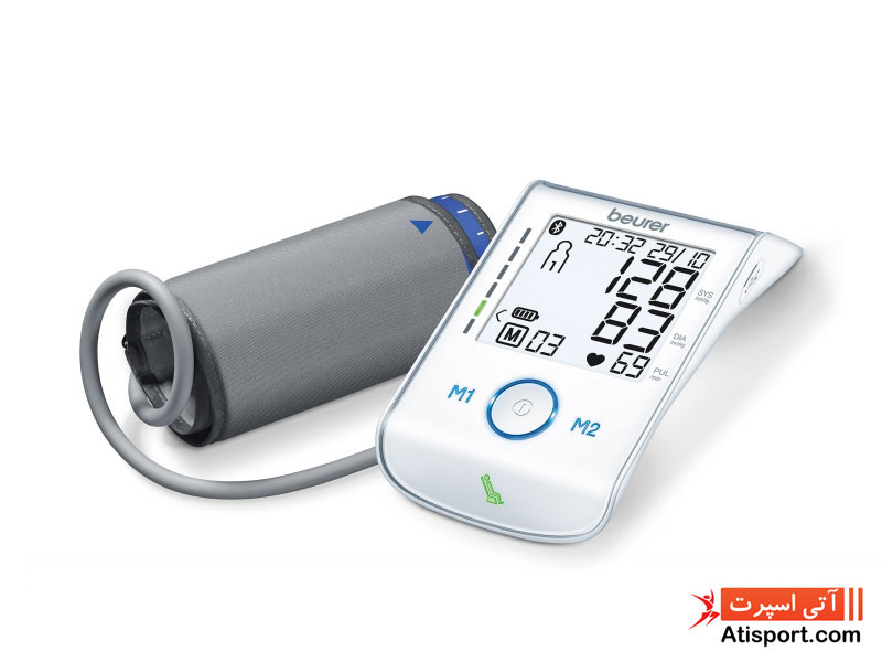 فشارسنج بازویی BM 85 بیورر جهت اندازهگیری کاملا اتوماتیک فشارخون و ضربان قلب از روی بازو میباشد. از ویژگیهای این محصول وجود بلوتوث، نرم افزار مخصوص سیستم عامل اپل، دکمه لمسی، حافظه 60×2، نشانگر حالت استراحت، نمایش زمان و تاریخ، نگهدارنده کاف، سیستم خاموشی خودکار و تشخیص آریتمی میباشد. این محصول متوسط فشارخون اندازهگیری شده در 7 روز گذشته را به شما نشان میدهد و مناسب استفاده دور بازوی 22 تا 36 سانتیمتر میباشد. از وسیله همراه این محصول باتری و کیف میباشد. این محصول دارای جایزه طراحی Reddot 2014، شاخص سازمان بهداشت جهانی (WHO)، قابلیت نصب رایگان نرم افزار HealthManager برای برنامه ریزی و نظارت بر آموزش و مدیریت بهداشت و درمان، جایزه Plus X 2014 و برنده جایزه Technik Zu Hause است.ویژگیهای کلی: اندازهگیری اتوماتیک فشارخون و ضربان قلب- دارای بلوتوث- نرم افزار مخصوص سیستم عامل اپل- فضای حافظه 60×2- نشانگر حالت استراحت- نمایش زمان و تاریخ- نگهدارنده کاف- سیستم خاموشی خودکار- تشخیص آریتمی قلب