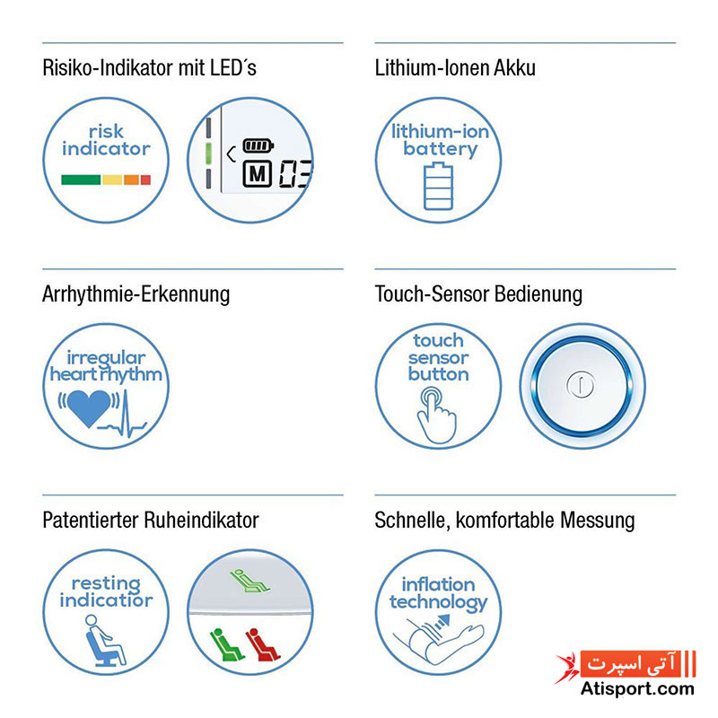 فشارسنج بازویی BM 85 بیورر جهت اندازهگیری کاملا اتوماتیک فشارخون و ضربان قلب از روی بازو میباشد. از ویژگیهای این محصول وجود بلوتوث، نرم افزار مخصوص سیستم عامل اپل، دکمه لمسی، حافظه 60×2، نشانگر حالت استراحت، نمایش زمان و تاریخ، نگهدارنده کاف، سیستم خاموشی خودکار و تشخیص آریتمی میباشد. این محصول متوسط فشارخون اندازهگیری شده در 7 روز گذشته را به شما نشان میدهد و مناسب استفاده دور بازوی 22 تا 36 سانتیمتر میباشد. از وسیله همراه این محصول باتری و کیف میباشد. این محصول دارای جایزه طراحی Reddot 2014، شاخص سازمان بهداشت جهانی (WHO)، قابلیت نصب رایگان نرم افزار HealthManager برای برنامه ریزی و نظارت بر آموزش و مدیریت بهداشت و درمان، جایزه Plus X 2014 و برنده جایزه Technik Zu Hause است.ویژگیهای کلی: اندازهگیری اتوماتیک فشارخون و ضربان قلب- دارای بلوتوث- نرم افزار مخصوص سیستم عامل اپل- فضای حافظه 60×2- نشانگر حالت استراحت- نمایش زمان و تاریخ- نگهدارنده کاف- سیستم خاموشی خودکار- تشخیص آریتمی قلب