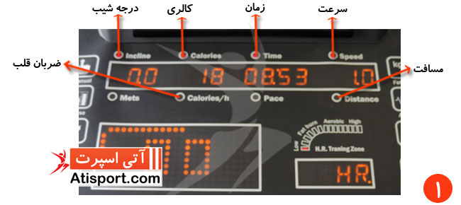 1 - در تصویر شماره 1 شما می توانید نمایشگر مانیتور تردمیل تایتان فیتنس TF1020 AC را که نشان دهنده کالری ، زمان ، مسافت ، ضربان قلب، درجه شیب، سرعت و 1 برنامه دستی و 15*8 برنامه از از قبل طراحی شده می باشد را مشاهده نمایید.