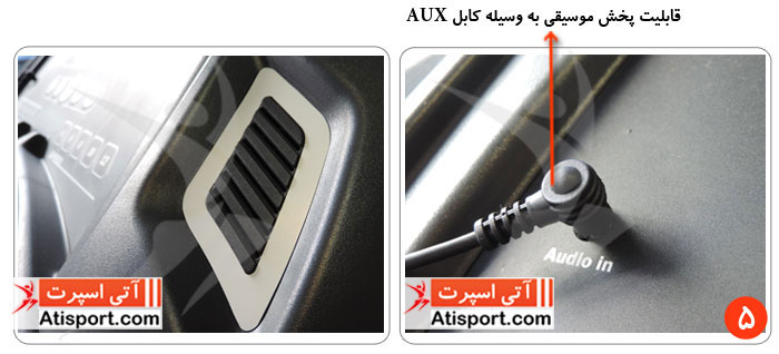 5 - در تصویر شماره 5 شما می توانید قابلیت پخش موسیقی به وسیله کابل AUX و اسپیکرهای قدرتمند تردمیل تایتان فیتنس TF1020 AC را مشاهده نمایید.