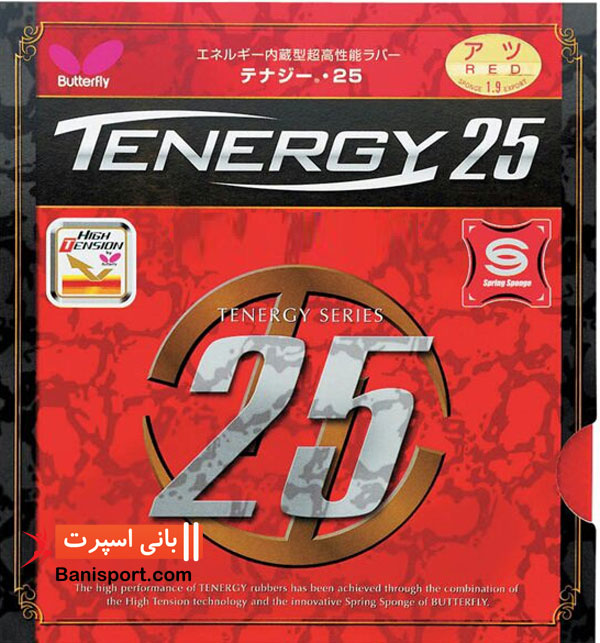 رویه پینگ پنگ Butterfly tenergy25 این رویه دارای فن آوری های SPRING SPONGE وHIGH TENSION و بواسطه دارابودن دون هایی با قطر بزرگتر بازی حمله ای نزدیک به میز را ایجاد میکند. رویه تینرژی25 مناسب برای ضربات سریع کوتاه ودفع پرقدرت توپ است. کلاس این رویه سرعت بالا (SUPER SPEED ) ، ضخامت 2.1mm و ساخت کشور ژاپن میباشد.