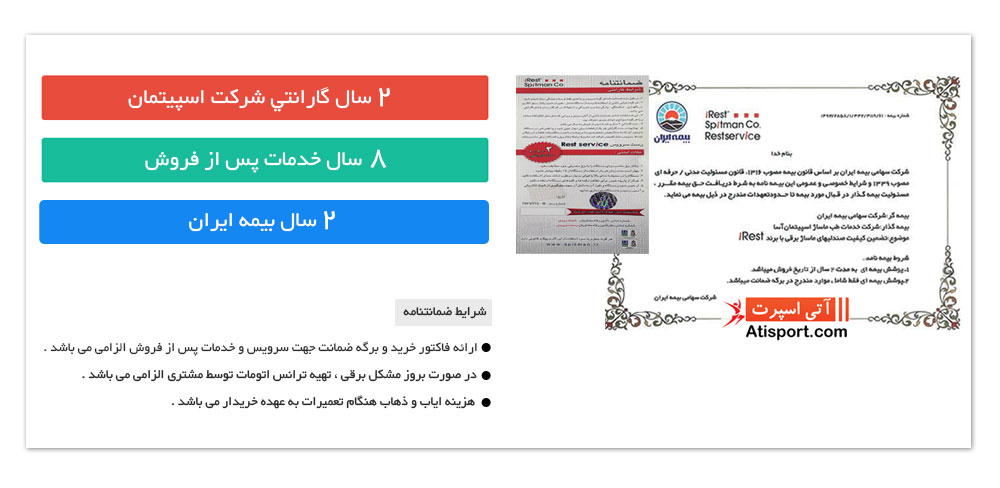2 سال گارانتي و 8 سال خدمات شركت اسپيتمان و 2 سال بیمه ایران