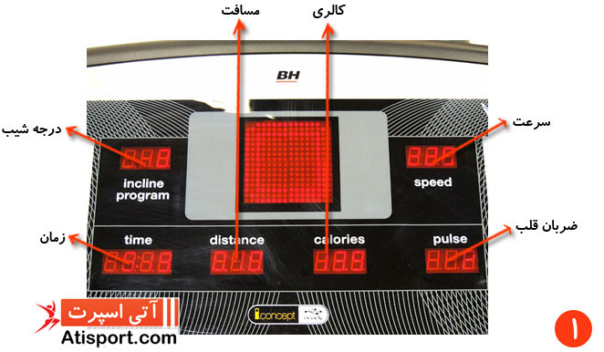 1- در تصویر شماره 1 می توانید مانیتور تردمیل BH Fitness I RC09 Dual را که نشان دهنده زمان، مسافت، کالری، ضربان قلب، سرعت می باشد، مشاهده نمایید .