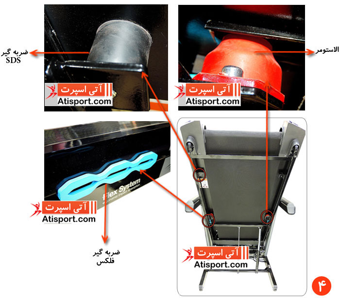 ضربه گیر فلکس یا بالشتی : این ضربه گیر بین شاسی دستگاه و پایه دستگاه قرار می گیرد و به نوعی تکمیل کننده ضربه گیرهای ASA ، SDS و الاستومر می باشد که به نرم تر کردن پیاده روی کمک می کند.